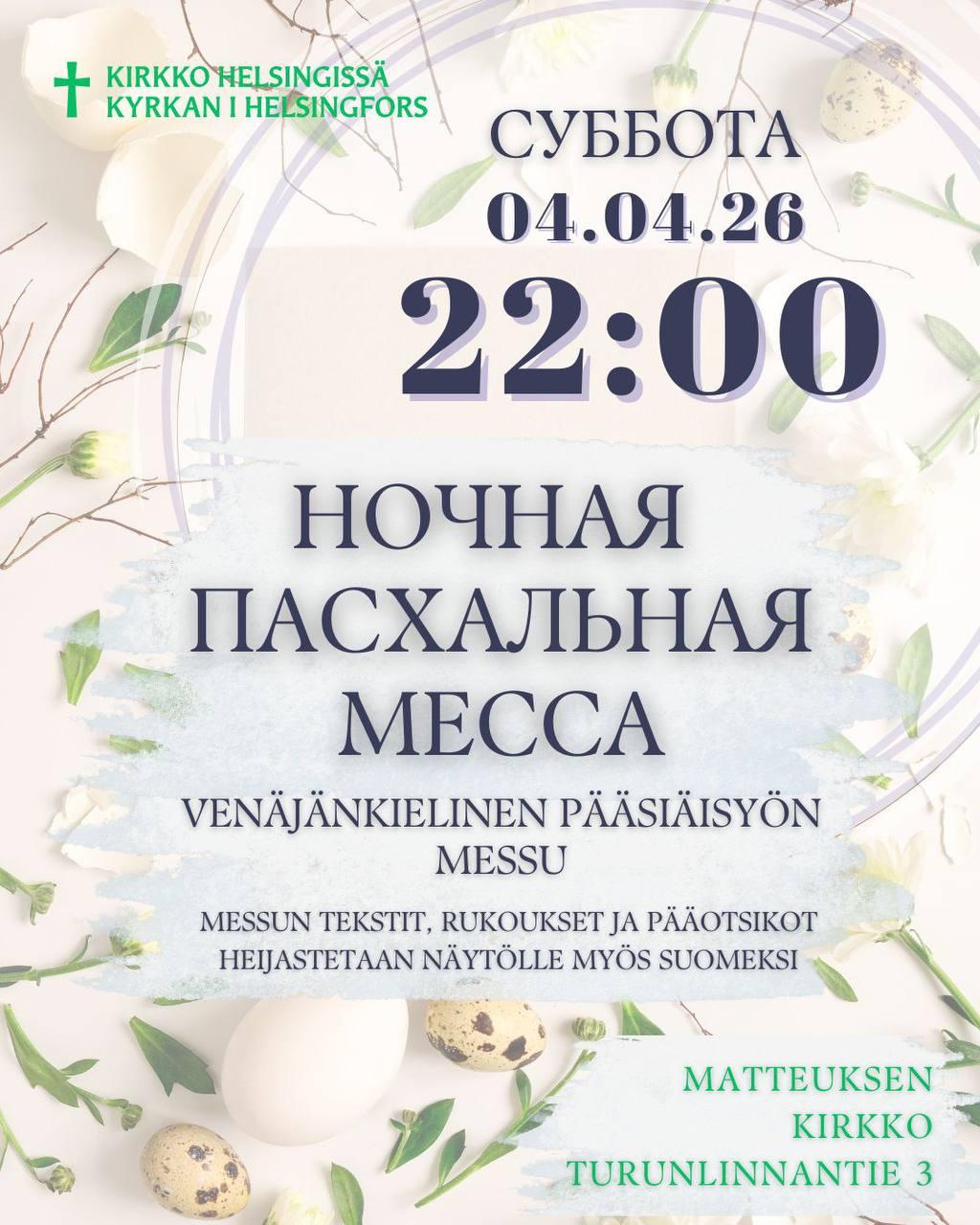Pääsiäisyön messu venäjän kielellä. Messun kulkua voit seurata näytöltä myös suomeksi. Messun jälkeen lyhyt ohjelma ja teetarjoilu pääsiäispashan kera. Halutessasi voit tuoda jotakin yhteiseen pöytään.