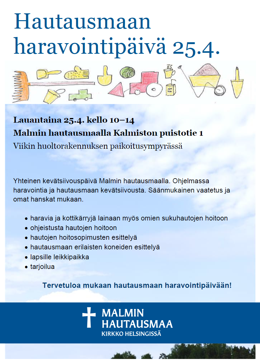 Hautausmaan haravointipäivä perjantaina 24.4. klo 10–14 Maunulan uurnalehdossa ja lauantaina 25.4. klo 10-14 Malmin hautausmaalla.