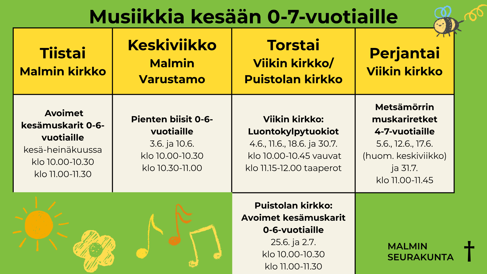Avoimet kesämuskarit 0-6-vuotiaille Malmin ja Puistolan kirkoilla