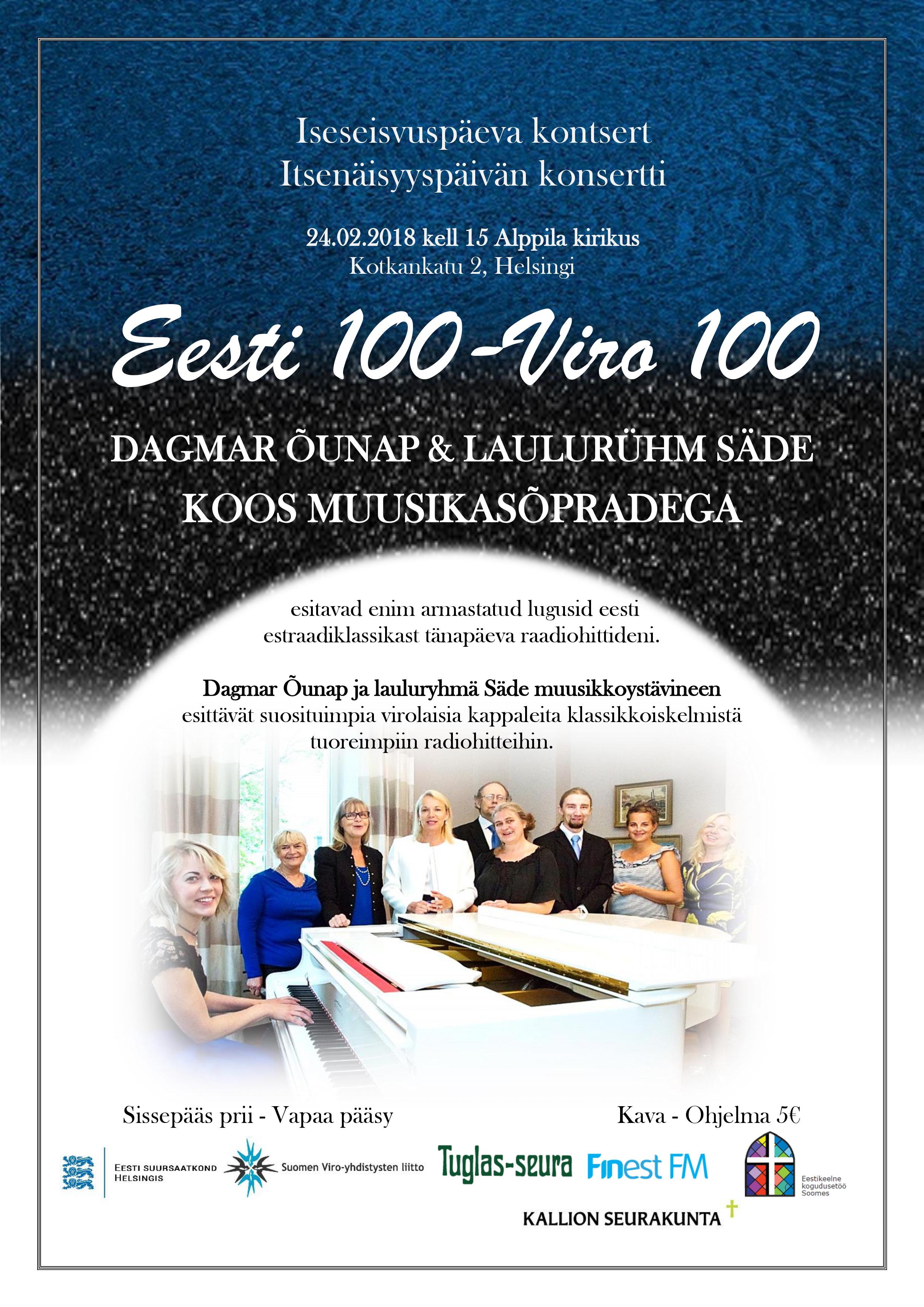 Alppila kirikus laupäeval, 24.2 kl 15:00. Esinevad Dagmar Õunap & laulurühm Säde koos muusikasõpradega. Kavas enim armastatud lugusid eesti estraadiklassikast tänapäeva raadiohittideni. Kontsert on tasuta, kava 5 eurot.