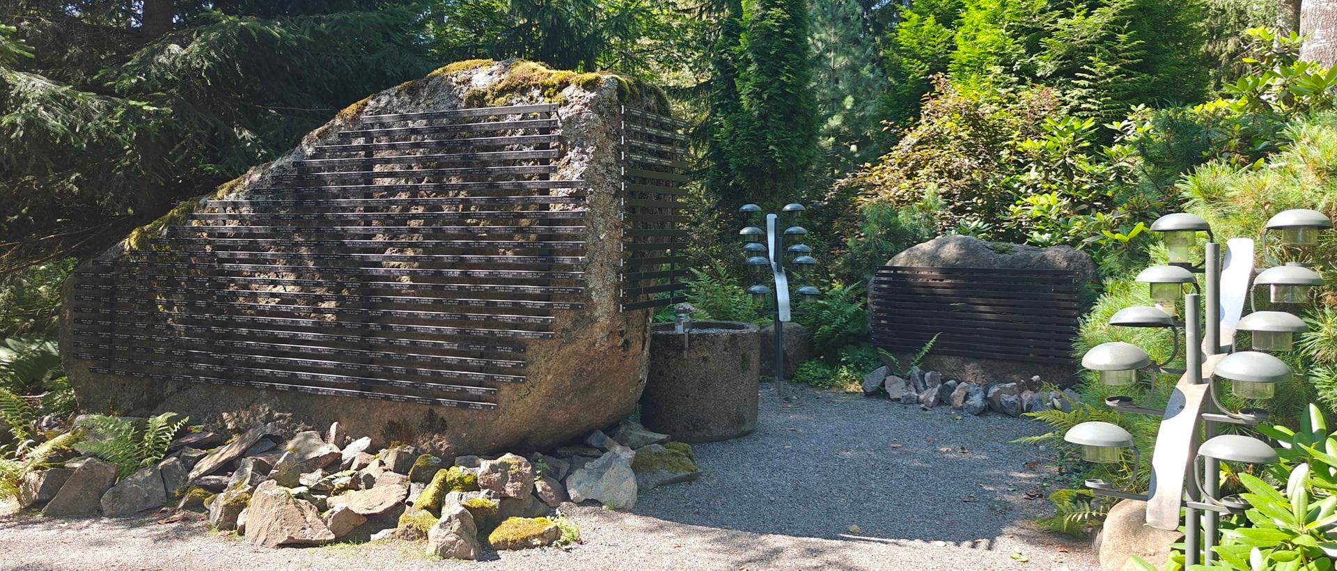 Graniitista ja liuskekiveyksestä tehty valaistu muistomuuri, jonka edessä laatoitus ja penkit.
