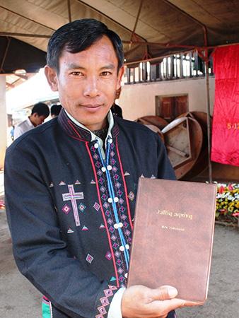 Thaimaan käännöskomitean puheenjohtaja Zumy Leipu esittelee akenkielistä Uutta testamenttia.