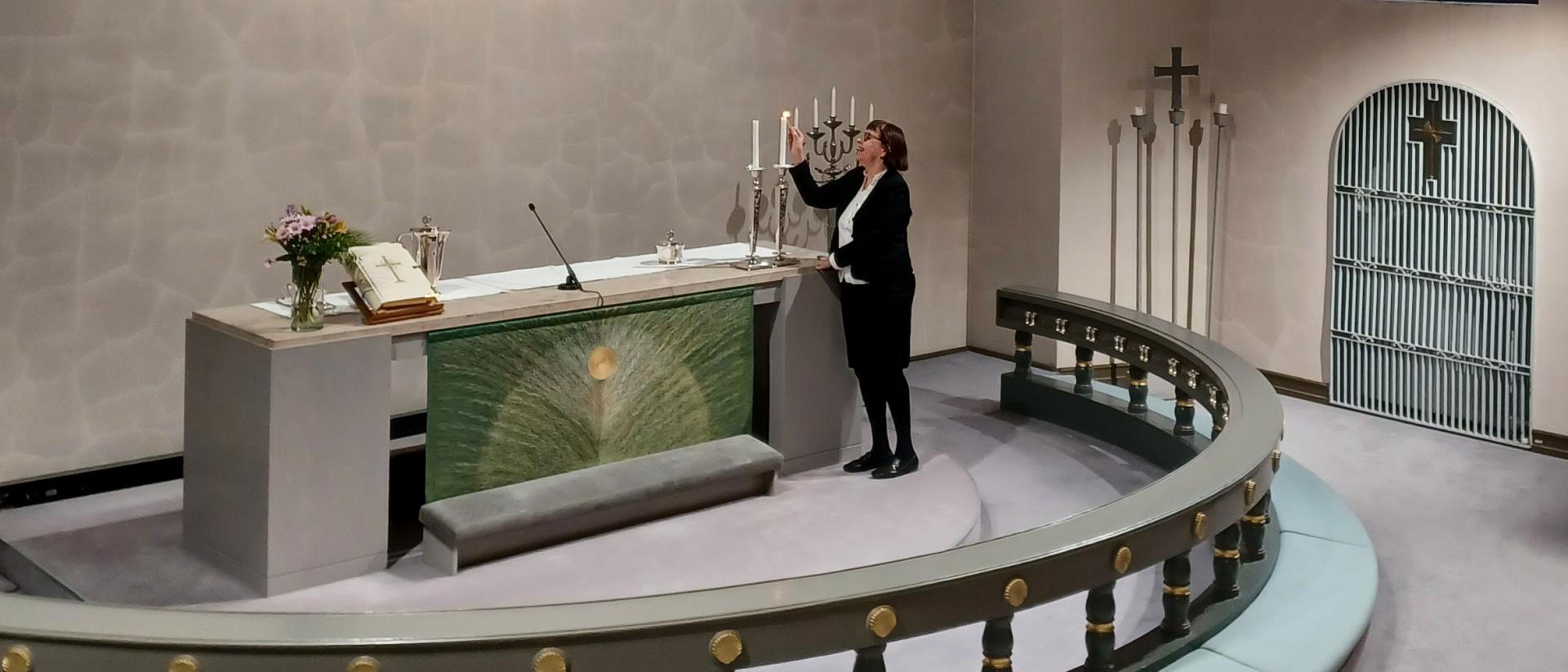 Kuvassa suntio sytyttää alttarikynttilät. Krusifiksi on jalasjärveläisen Elias Ilkan (1889-1968) tekemä. Antependium on tekstiilitaitelija Helena Vaarin käsialaa. Hopeiset kynttilänjalat on takonut Henry Ericsson.
