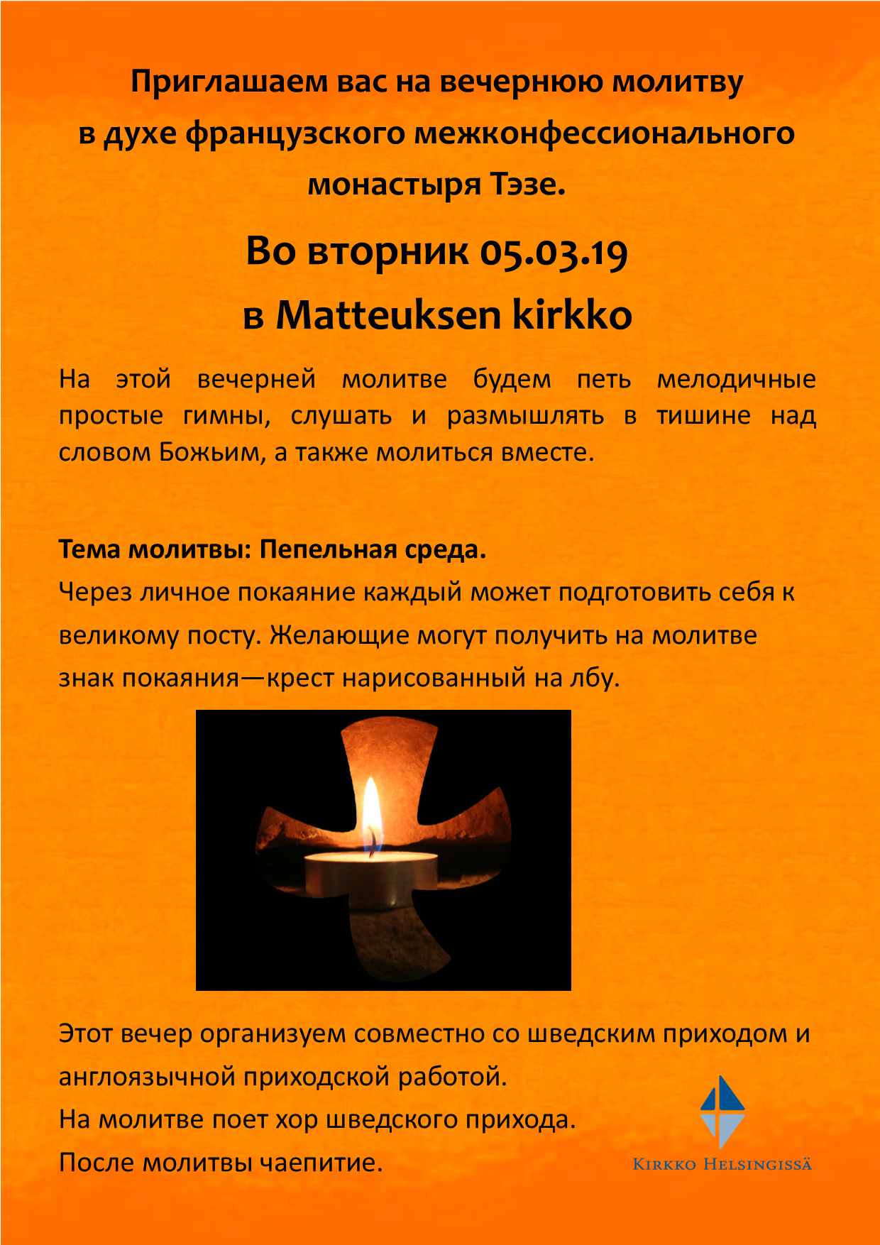 Добро пожаловать на молитву тишины, которую мы организуем силами трех приходов, которые собираются в церкви Св. Матфея. Начало в 18:00.