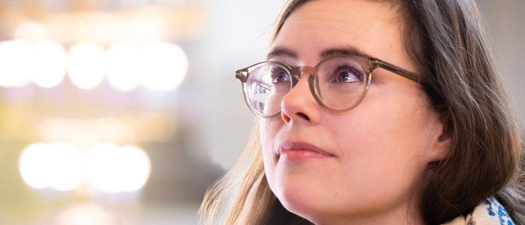 Lähikuva silmälasipäisestä naisesta, joka katsoo viistosti ylöspäin