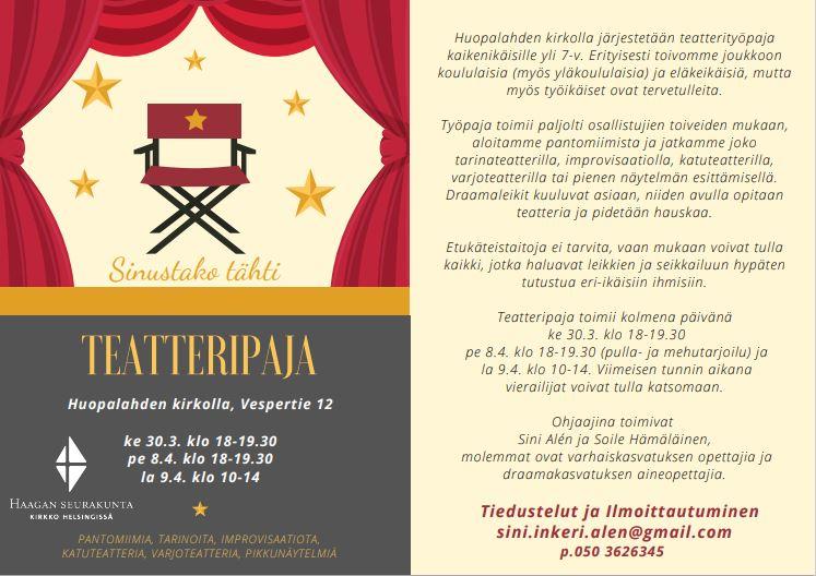 Teatteripaja kokoontuu Huopalahden kirkolla, Vespertie 12, ke 30.3. klo 18-19.30, pe 8.4. klo 18-19.30, la 9.4. klo 10-14.