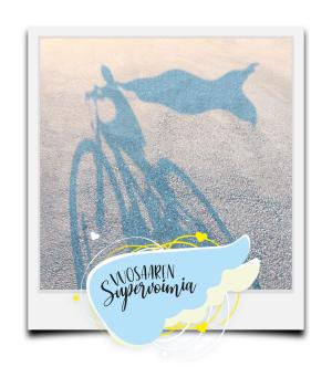 Polaroid kuva jossa pyöräilevän supersankarin varjo, lisäksi vuosaaren supervoimia logo.
