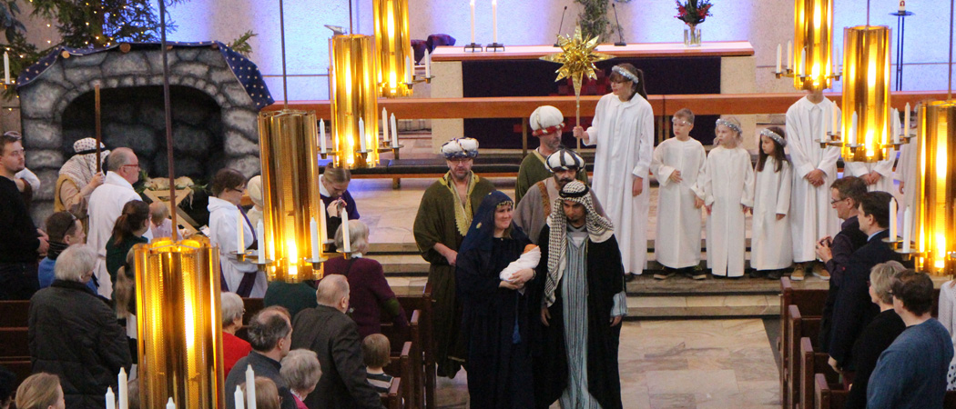 Betlehem-kuvaelma Lauttasaaren kirkossa, Myllykallionrinne 1. Perinteinen Betlehem-kuvaelma messun saarnan paikalla. Mukana Maria ja Joosef, lasten enkelikuoro, paimenia ja lampaita sekä Itämaan tietäjät.