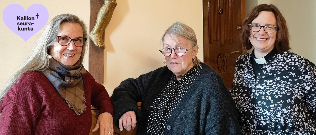 Kuvassa: Torstaina iltapäivällä -tilaisuudessa keskustelivat Kaisa Raittila (vas), Hilkka Olkinuora ja tilaisuuden juonsi kirkkoherra Riikka Reina (oik).