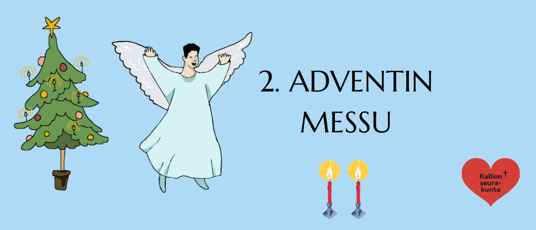 Tervetuloa 2. adventin messuun Kallion kirkkoon! Mukana pappi Helmi Pykäläinen, kanttori Tommi Niskala. Messun jälkeen nautitaan kirkkokahvit.