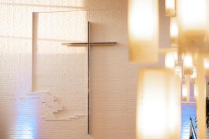 Kirkkoon tulijaa tervehtivät eteisessä sanat ”Palvelkaa Herraa ilolla, tulkaa hänen kasvojensa eteen riemulla” (Ps. 100:3). Kirkon alttariseinän tiilireliefi symboloi Golgatan kalliolla seisovaa ristiä ja tyhjää hautaa sen juurella. Alttariseinällä on myös kolme ikonia, jotka kuvaavat Jeesuksen syntymää, kuolemaa ja ylösnousemusta. Alttarilla on lahjoituksia ystävyysseurakunnilta, alttariliina unkarilaisesta Csepelin seurakunnasta ja ehtoollisleipälautanen romanialaisesta Bácsfalun seurakunnasta.