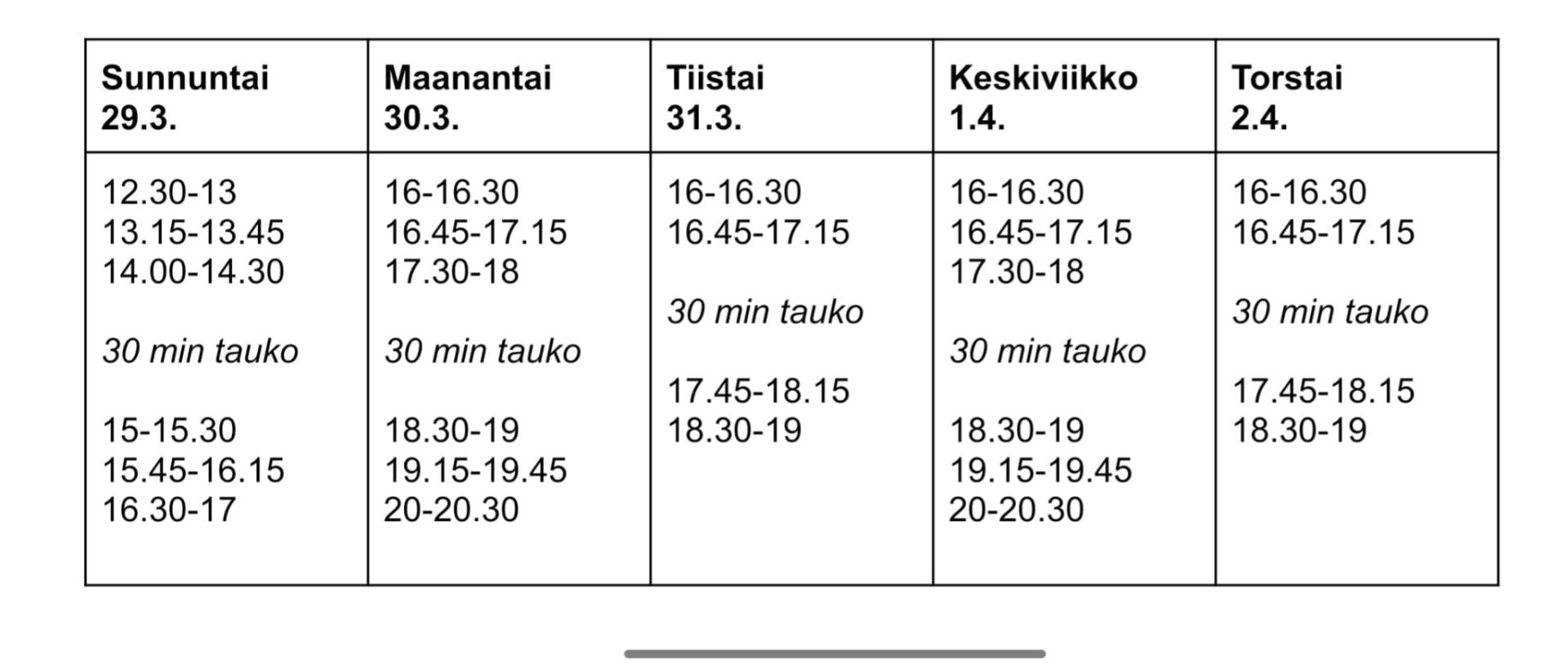 Esitykset alkavat palmusunnuntaina ja päättyvät kiirastorstaina. Kirkkokahvila on esityspäivinä auki sunnuntaina klo 12-18 ja arkisin klo 10-20.