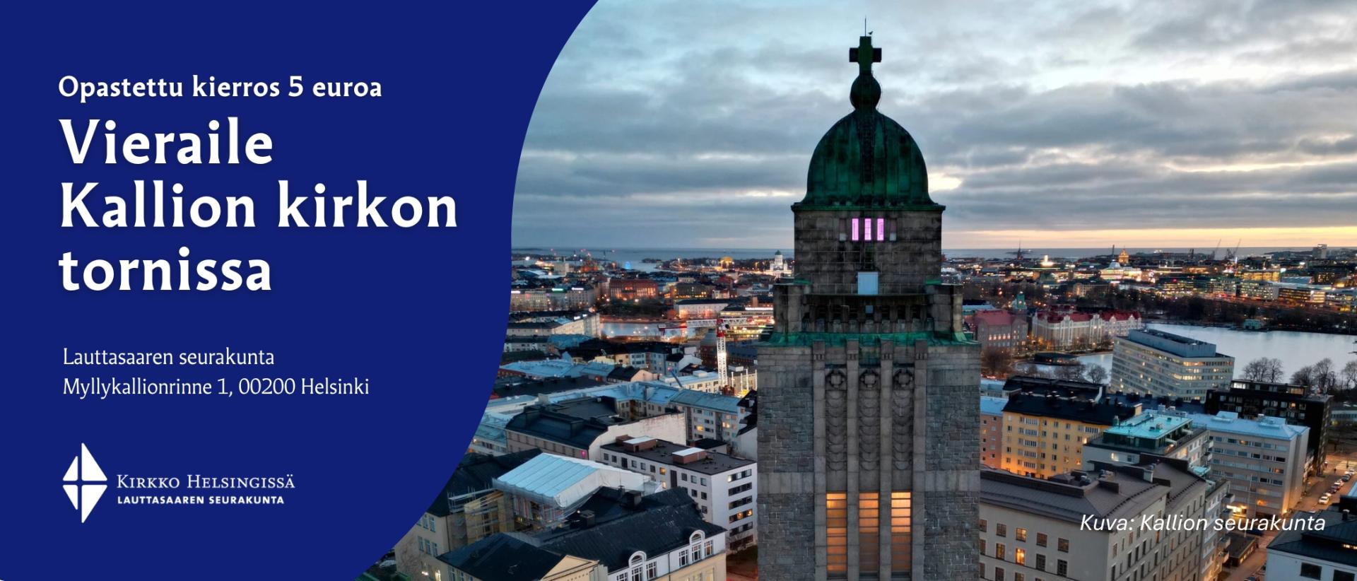 Tervetuloa tutustumaan 113-vuotiaan Kallion kirkon torniin lauantaina 13.9. Ville Elomaan opastamana. Kansallisromanttisen maamerkin 273 porrasta kiipeämällä pääset näkemään Helsingin aivan uudesta näkökulmasta.
