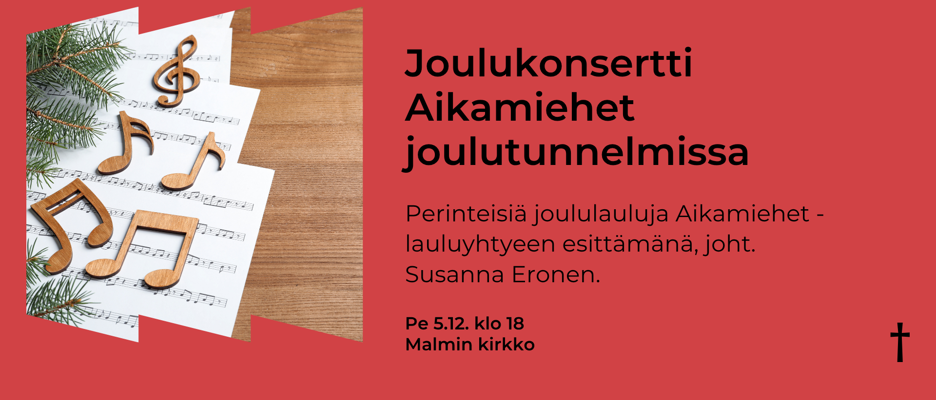 Joulukonsertti Aikamiehet joulutunnelmissa Malmin kirkko pe 5.12. klo 18. Perinteisiä joululauluja Aikamiehet -lauluyhtyeen esittämänä, joht. Susanna Eronen. Vapaa pääsy, ohjelma 10€.