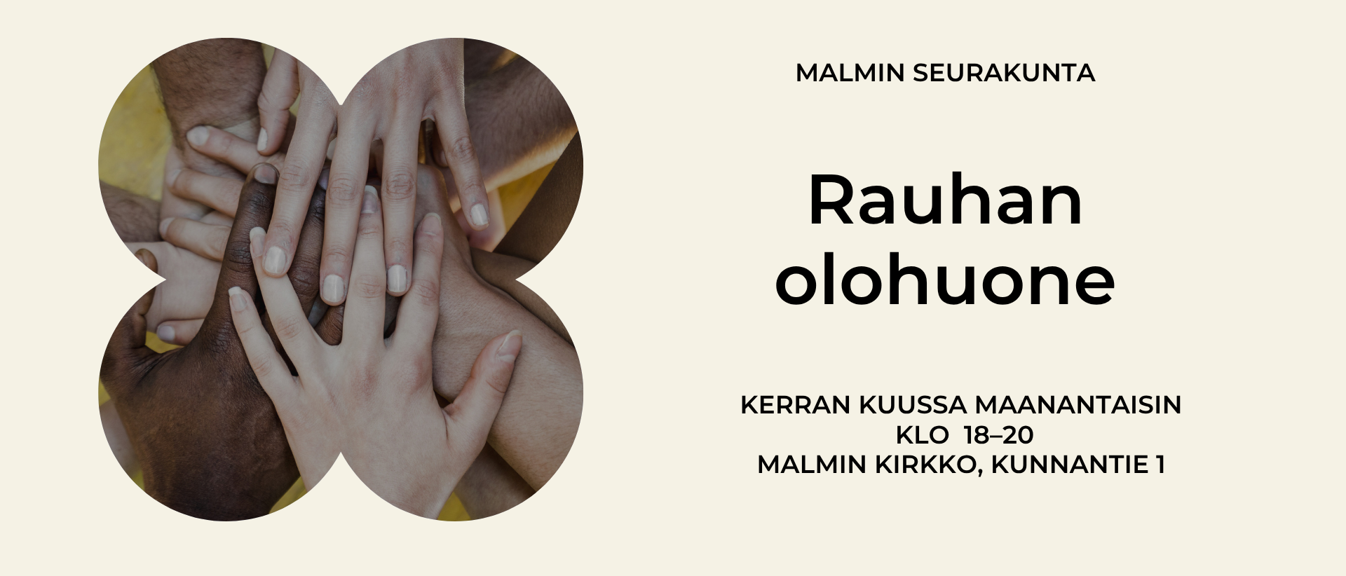 Rauhan olohuone Malmin kirkolla Kirkonkulmassa kerran kuukaudessa: maanantai 26.1., 23.2., 23.3., 27.4. ja 25.5.2026. Osoite: Malmin kirkko, Kunnantie 1. Tule sisään Kirkonkyläntien puolelta, vieressä on bussipysäkki.