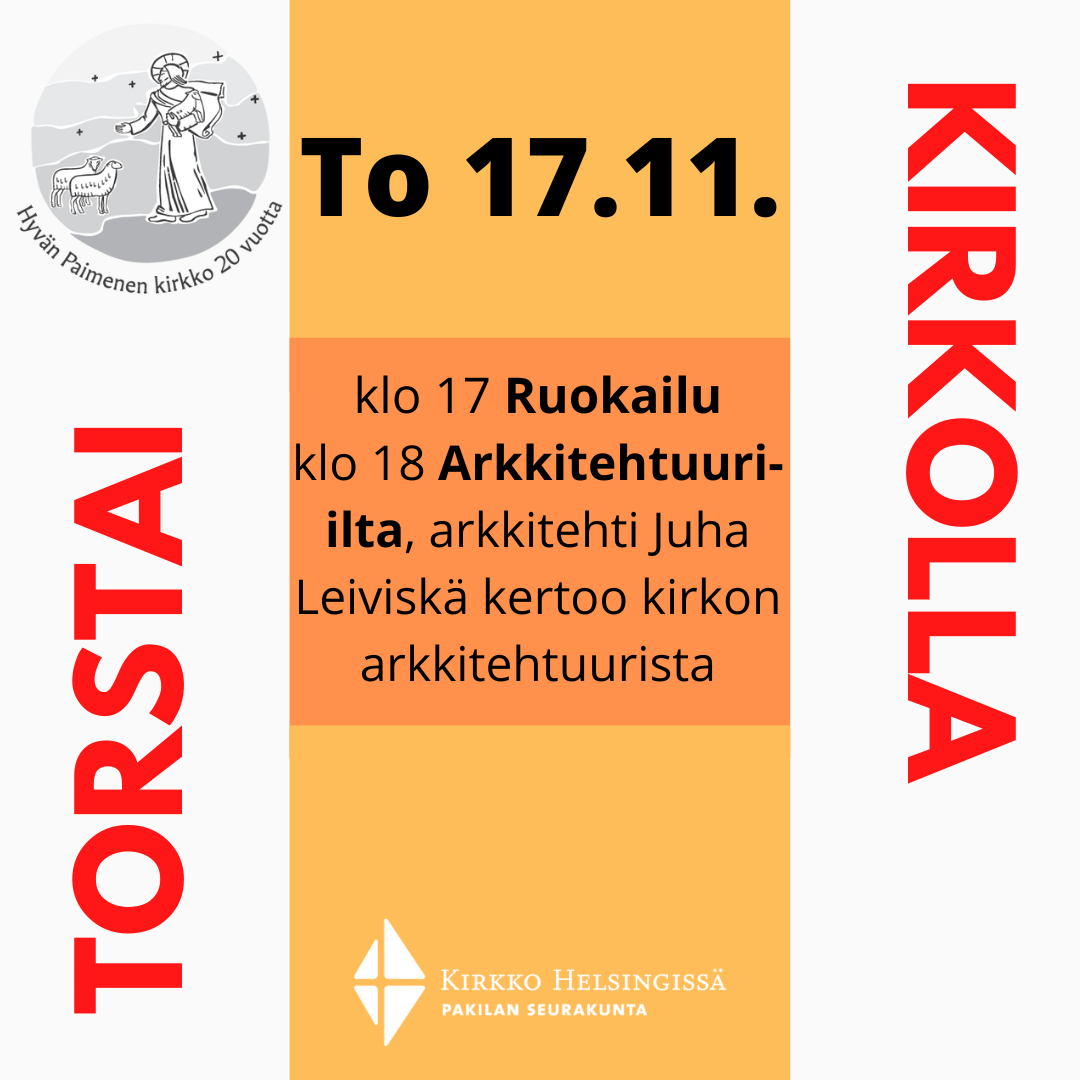 Torstai kirkolla 17.11. aiheenamme on 20 vuotta täyttävä Hyvän Paimenen kirkko