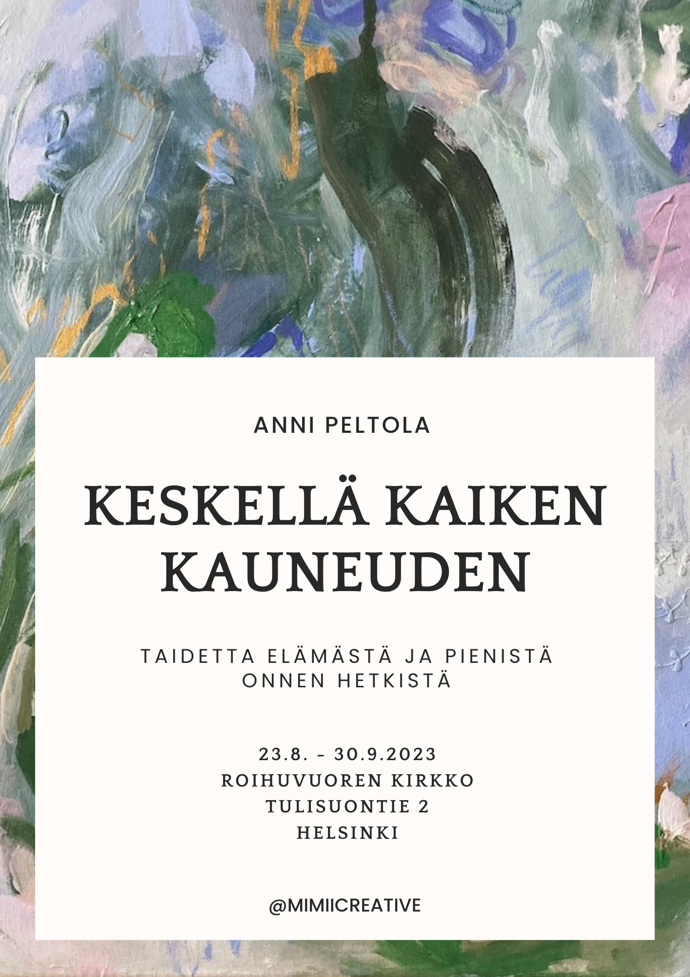 Helsinkiläisen taiteilijan teoksia on esillä Roihuvuoren kirkon kirkko- ja seurakuntasalissa, kahvio Huilissa sekä kappelissa. Teoksissa käsitellään naiseutta, äitiyttä, elinvoimaista luovuutta ja oman itsensä etsimistä. Teoksissa on yhdistetty akryylimaalausta ja kollaasia, ja ne ovat vuosilta 2021-2023.