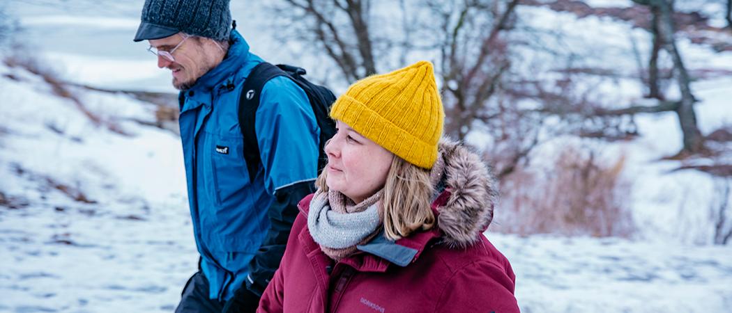 Mies sinisessä takissa ja pipossa ja nainen värikkäissä vaatteissa kävelevät lumisessa maisemassa