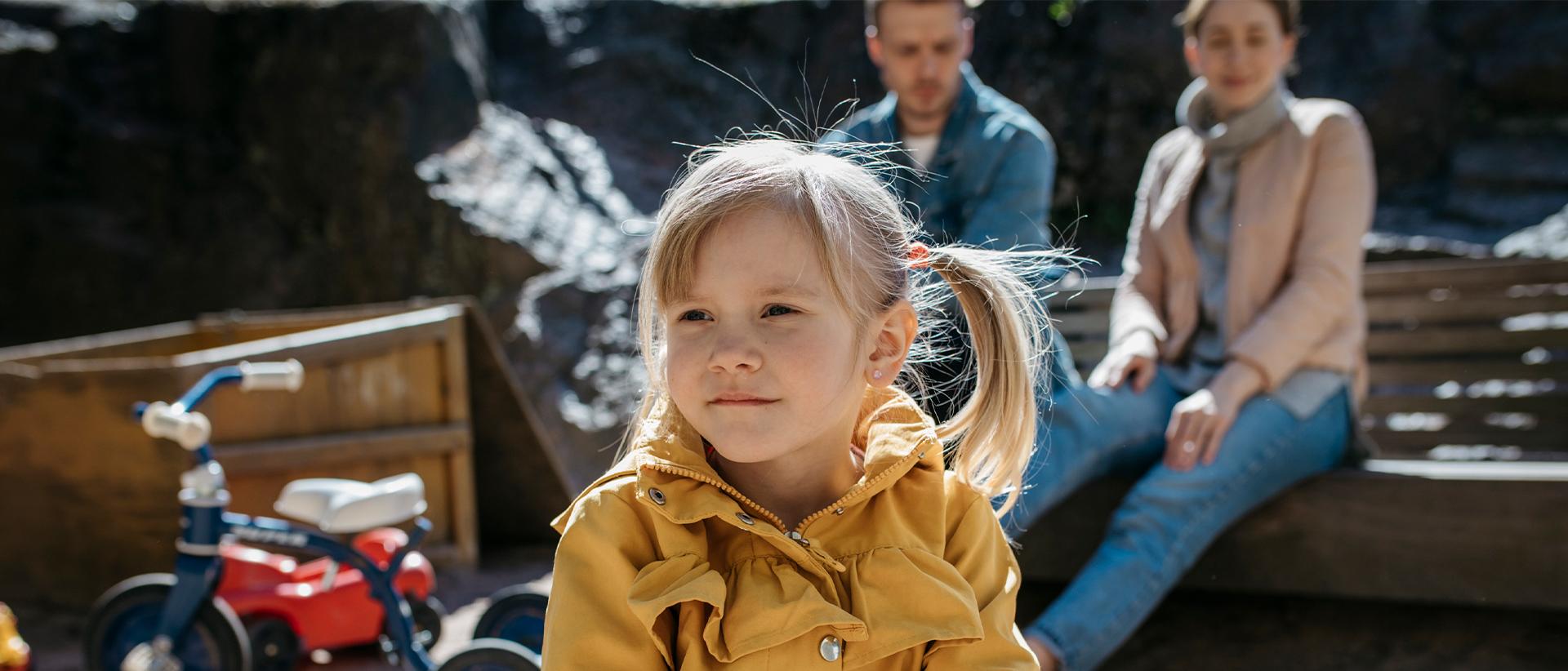 Etualalla saparopäinen pikkutyttö keltaisessa takissa. Takana vanhemmat istuvat hiekkalaatikon reunalla. Kuva: Elina Manninen