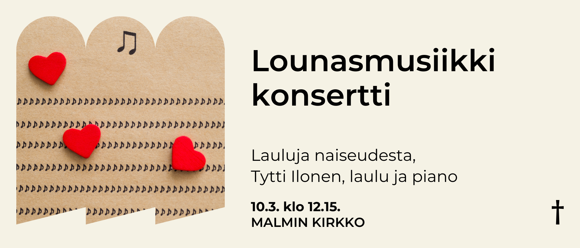 Tervetuloa lounasmusiikkikonserttiin Malmin kirkkoon ti 10.3. klo 12.15. Lauluja naiseudesta, Tytti Ilonen, laulu ja piano.