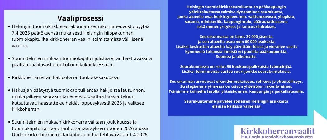 – Viime vuonna päivitetty strategiamme antaa meille hyvää evästystä, toteaa seurakuntaneuvoston varapuheenjohtaja Lari Ahokas. – Etsimme henkilöä, joka haluaa toimia arvojohtajana ja edustaa monimuotoista seurakuntaamme – ei vain omalle jäsenistöllemme, vaan kaikille helsinkiläisille ja koko kirkolle valtakunnallisesti.