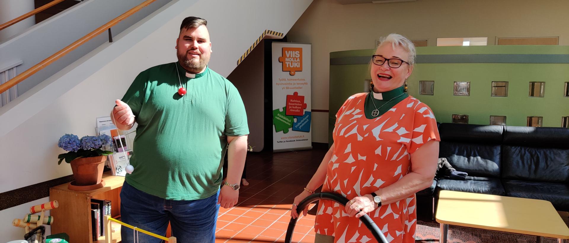 Kuvateksti: Mika kertoo kohdanneensa joskus ihmetystä siitä, että diakoniatyöntekijänä onkin mies. Samoin diakonissoina työskentelee miehiäkin. Pirjoa ja Mikaa huvittaa myös välillä vastaantuleva ennakkoluulo, että kirkon työntekijää pitäisi suojella elämän karheudelta. Heidät kuvattiin Malmin Varustamon pihapelien keskellä.