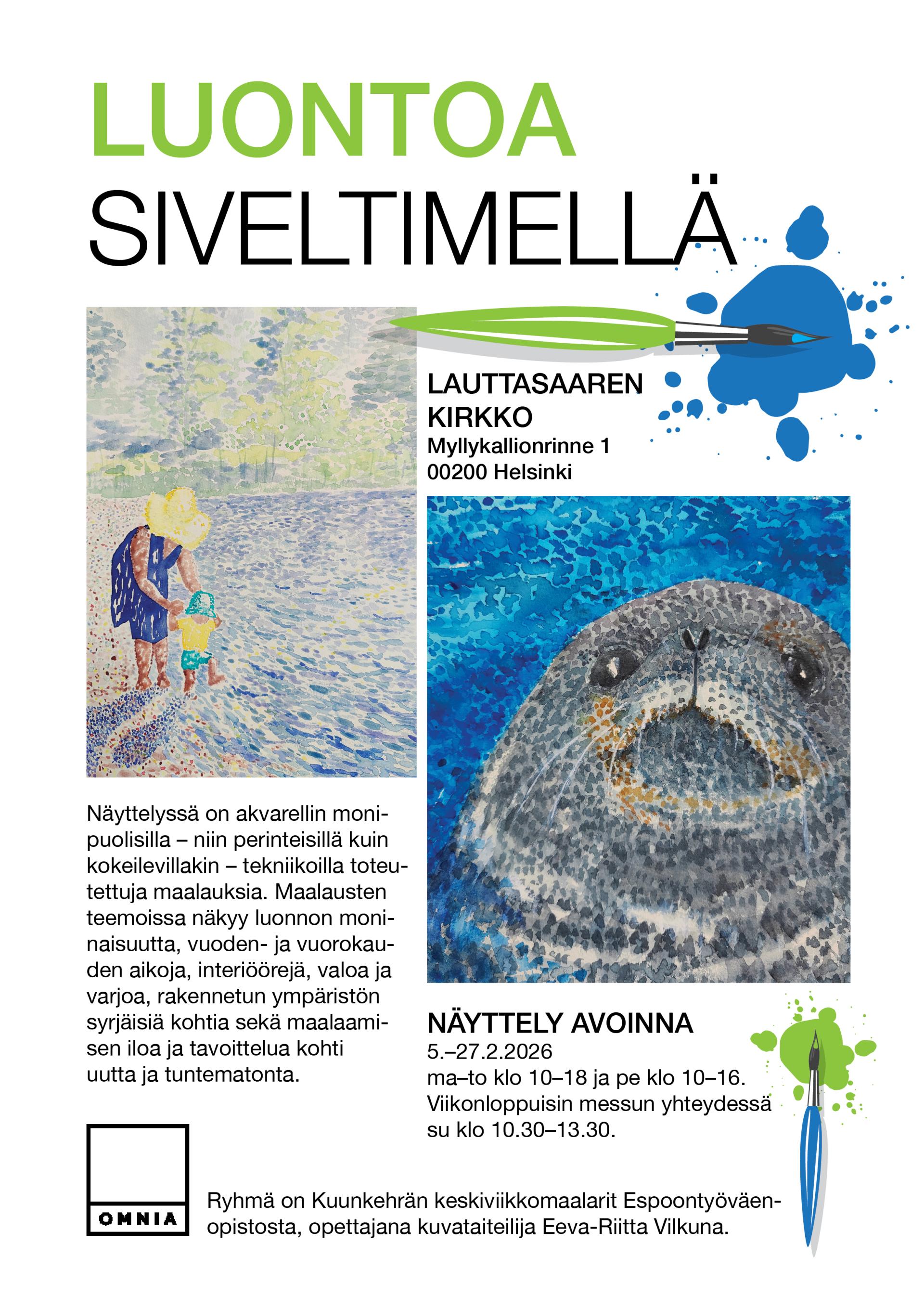 Näyttely on esillä Lauttasaaren kirkon kirkkosalin ja B-rapun aulassa 1.2.–28.2.2026.