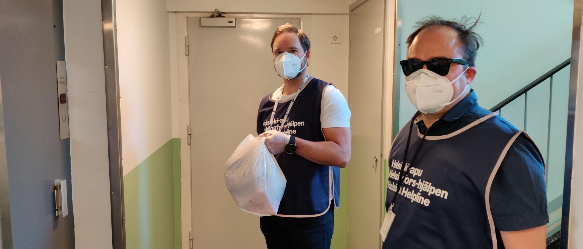 Kuljettajat jättävät ruokakassin ovelle, soittavat ovikelloa ja toivottavat kassin saajalle turvavälin päästä hyvää päivän jatkoa.