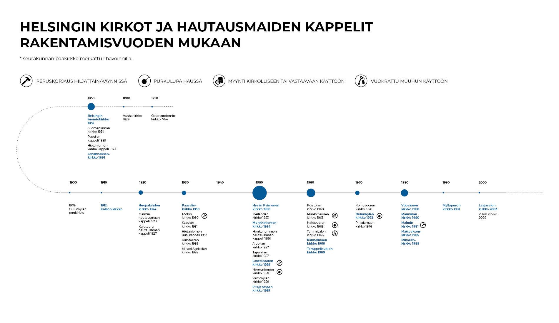 Helsingin seurakunnat ovat tehneet viime aikoina muutamia merkittäviä kirkkokiinteistöjä koskevia päätöksiä: luovuttavien joukossa ovat Munkkivuoren ja Oulunkylän kirkot. Tässä kuussa Kallion seurakuntaneuvosto käsittelee Alppilan kirkon kohtaloa ja Malmilla luottamushenkilöt päättävät, luovutaanko Tapulin ja Siltamäen seurakuntaloista.
