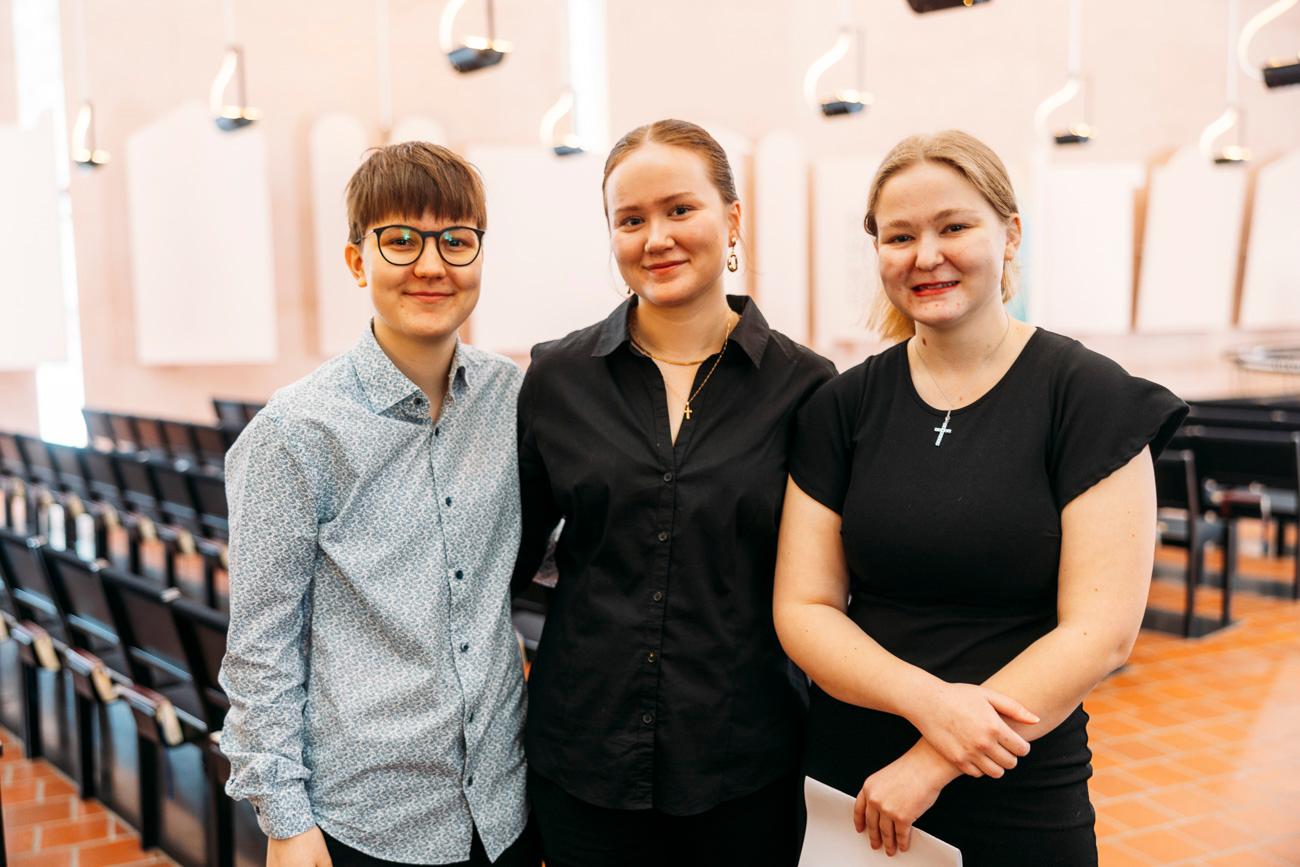 Tekstinlukijat Valo Hytönen, Sirja Pitkänen ja Roosa Ristlakki Mikaelinkirkossa. Kuva: Jani Laukkanen