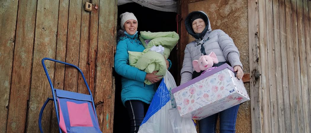 Kuvassa Bulgariassa äitiyspakkauksia perille toimittavia avustushenkilöitä äitiyspakkausten kanssa.