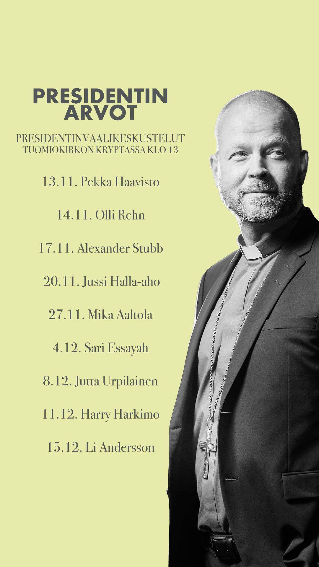 Helsingin hiippakunnan piispa Teemu Laajasalo haastattelee marras-joulukuussa presidentinvaaliehdokkaita Helsingin tuomiokirkon kryptassa. Presidentin arvot -keskustelusarjassa jokaista ehdokasta haastatellaan yksi kerrallaan noin tunnin ajan. Keskustelusarjassa mukana ovat ehdokkaista Mika Aaltola, Li Andersson, Sari Essayah, Pekka Haavisto, Jussi Halla-aho, Harry Harkimo, Olli Rehn, Alexander Stubb ja SDP:n ehdokas.