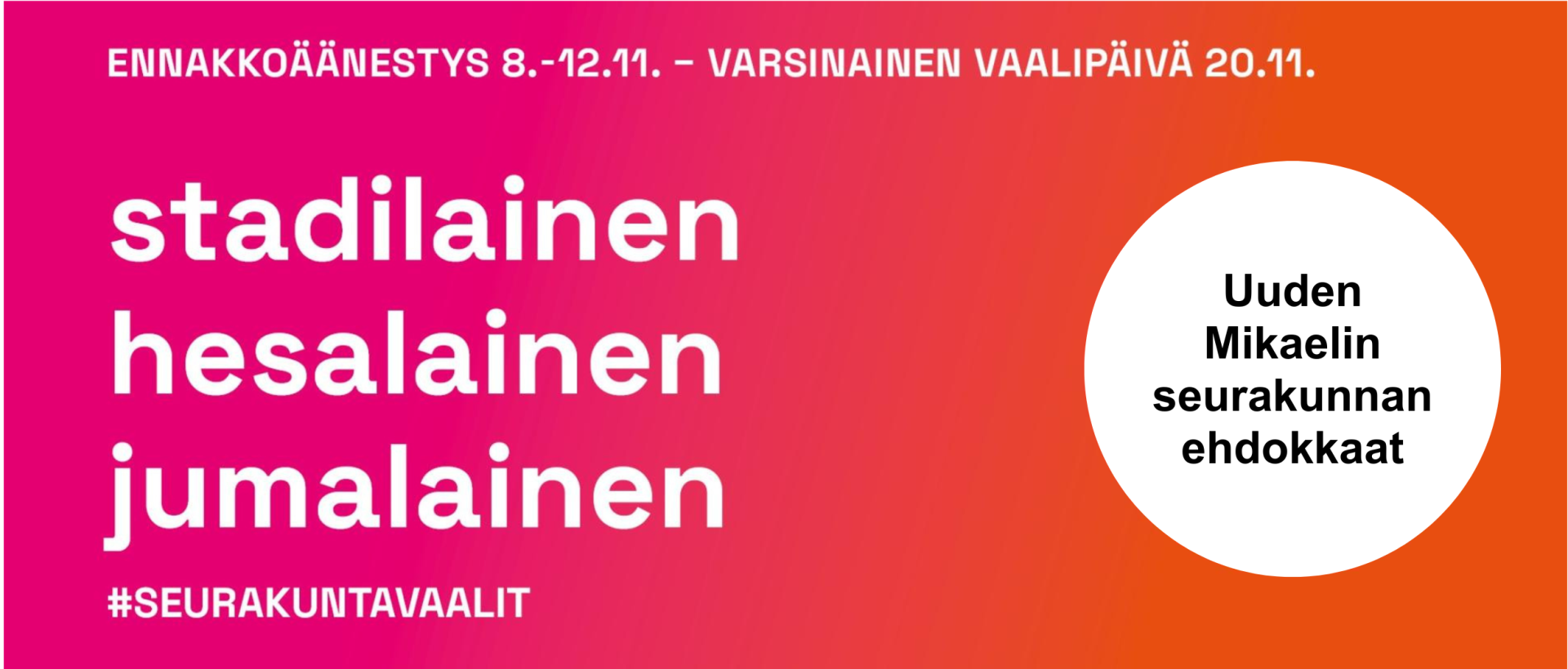 Syksyn 2022 seurakuntavaaliehdokkaita uuteen Mikaelin seurakuntaan oli 37. Vaalit käydään 20.11.2022 ja ennakkoäänestys on 8.-12.11.