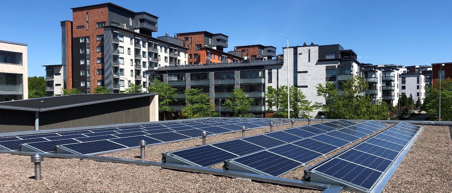 Kuvassa Viikin kirkon katolla olevat aurinkopaneelit.