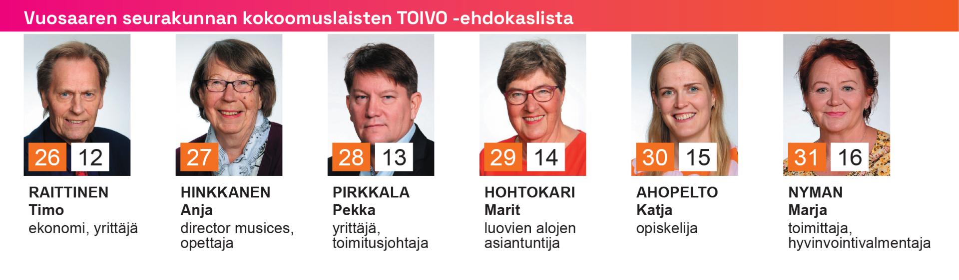 TOIVO: seurakuntaneuvosto 6 ehdokasta, yhteinen kirkkovaltuusto 5 ehdokasta.